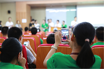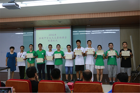 31日晚,在结束了一天的考试后,营员们迎来了本届暑期课堂最后的狂欢——闭营仪式。闭营仪式由北京大学天文学系刘富坤教授主持,来自北京大学科维理所、国家天文台,北京师范大学和北京天文馆的老师们为参与暑期课堂的中学教师和同学们颁发了证书。来自成都七中的李开祥老师做了“我喜欢不确定性”的即兴演讲,表达他对被意外邀请参加暑期课堂的激动、对暑期课堂期间老师和同学们付出的感谢、对能聆听大师讲座和学习前沿天文知识的满足,表示将在今后的教学工作中宣传普及天文知识。在稍后进行的联欢晚会中,多才多艺的营员们用自己的方式抒发了对本届暑期课堂的眷恋。晚会在马门溪龙小组的《我爱北京天文馆》和《国际歌(天文版)》中来到高潮!