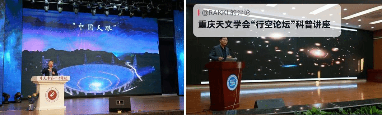 会议期间和会议后,国家天文台研究员、FAST首席科学家李菂(左)在重庆一中、北京大学科维理所王科研究员(右)在重庆九十四中做科普报告。两场科普报告共吸引了1500多名师生参加,并有超过50万人次在线观看。