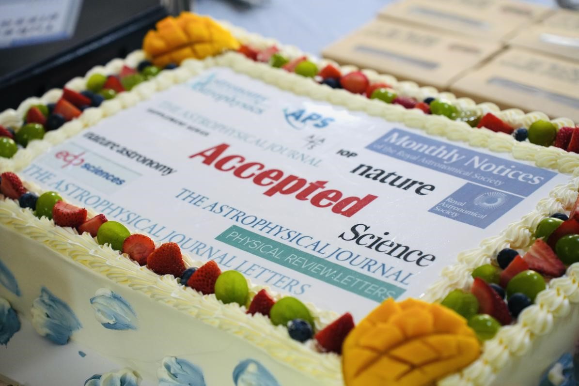 科维理所庆祝会现场热闹非凡,美食、气球、画板……整个一楼大厅被装点得五彩斑斓,充满了欢声笑语。而那款创意十足的庆祝蛋糕更是吸引了所有人的目光——它巧妙地融入了顶级天文刊物的接收函元素,寓意着毕业生们即将踏上科研之路,追寻自己的星空梦想,也表达了北大天文学科老师对毕业生的美好祝愿。
