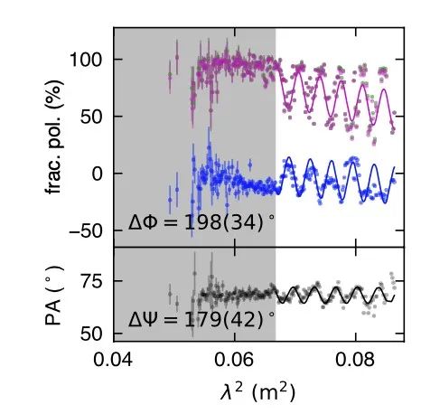 图2:FRB 20201124A 中探测到的线/圆偏振度和偏振位置角的振荡现象。
