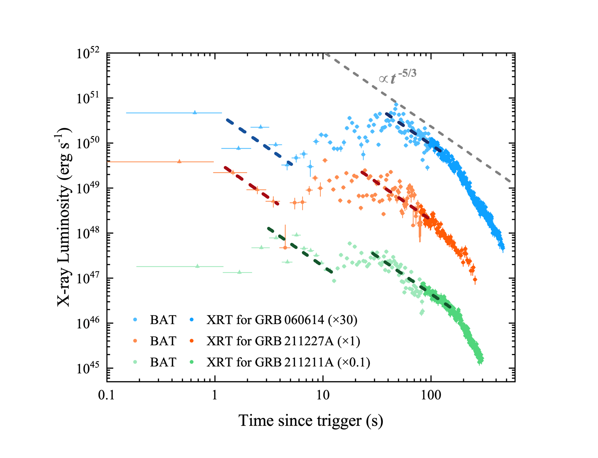 图1: 三例致密星并合起源长伽马暴的X射线波段辐射,虚线代表回落吸积过程。
