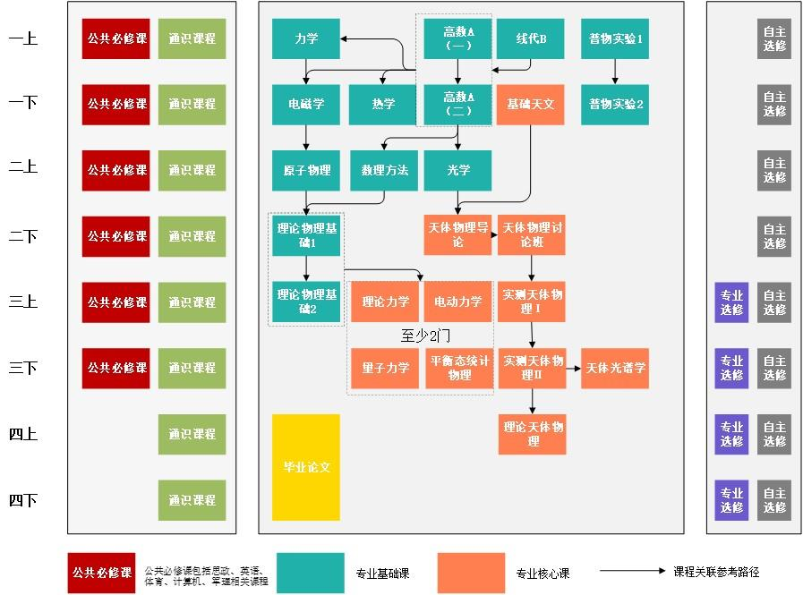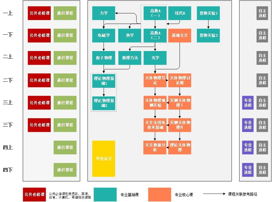 天文学专业设置“天体物理”和“天文高新技术与应用”两个专业方向。满足其中任一方向的要求即可毕业。强基专业物理学IV(天体物理学)培养方案跟天文学(天体物理方向)培养方案一致。