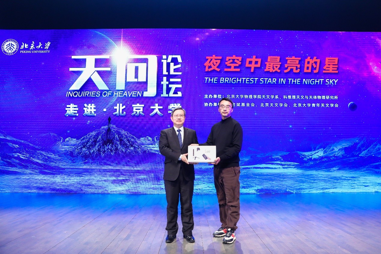 之后,振旺光电有限公司创始人文佳总经理向北大天文学系赠送小型智能天文望远镜,光速视觉(北京)科技有限公司创始人邱虹云博士向北大天文学系赠送最新款天文相机。两位在国内外享有盛誉的天文设备公司总经理希望这些设备能为北大及中国天文科普和科研事业作出贡献。