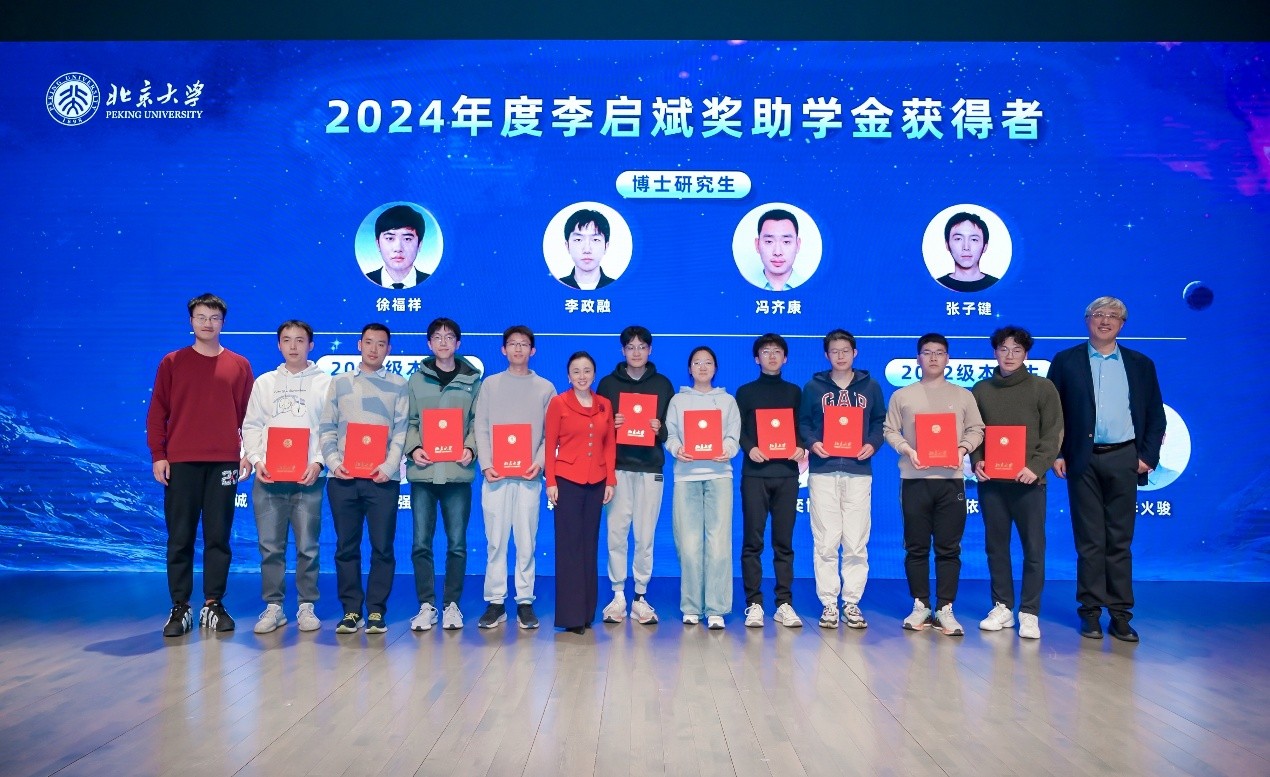 李启斌先生是我国著名天文学家,曾担任 11 年中国科学院北京天文台(中国科学院国家天文台前身)台长,两届中国天文学会理事长,为中国天文事业的发展和人才培养作出了卓越贡献。1998年后担任北京大学兼职教授,讲授的 “天文与艺术” 通选课深受学生喜爱。李启斌先生的女儿、李启斌基金会理事长李亦非女士介绍了“李启斌奖助学金” 的设立缘由。她表示,非常荣幸能够在举世闻名的北京大学设立 “李启斌奖助学金”。该奖学金旨在奖励并助力北大学子投身天文事业追逐梦想,也是为了告慰父亲对鼓励年轻学子学习天文等基础学科的期许。随后,在一段介绍首届北京大学“李启斌奖助学金”获奖的六名本科生同学和四名研究生的视频播放后,十名获奖学生上台领奖,北京大学物理学院院长高原宁院士与李亦非女士共同为他们颁发了获奖证书。