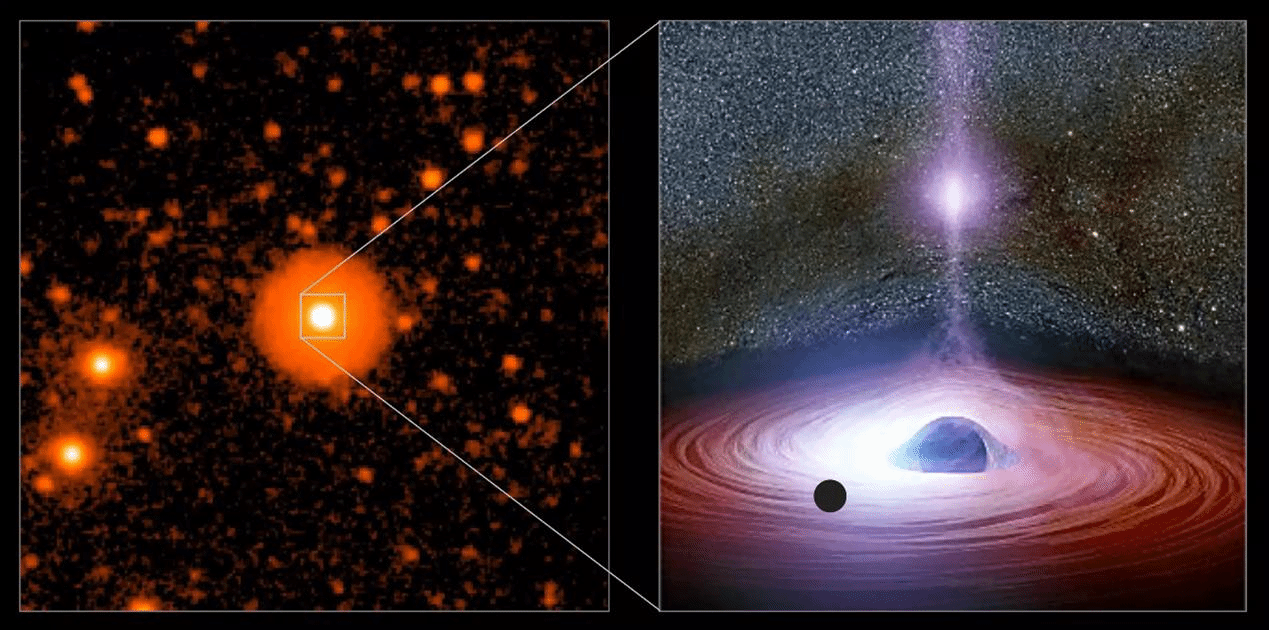 图1:左图展示了用SWIFT拍摄的OJ 287及其环境的深紫外图像。这是迄今为止对该部分天区拍摄的最深的紫外图像之一,联合了560次单次曝光。该视场内最亮的光源是OJ 287。黑洞区域本身不能在UV图像中分辨。右画描绘了艺术家对OJ 287中心的设想,包括吸积盘、喷流和围绕1亿个太阳质量的主黑洞绕转的次黑洞。