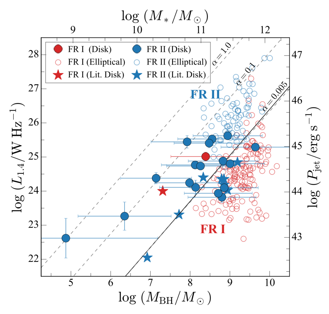黑洞喷流能量与黑洞质量关系。图中上横轴为星系恒星质量,下横轴为黑洞质量,左纵轴为喷流的辐射强度,右纵轴为喷流的能量强度。实心圆点表示本工作新认证的含射电噪活动星系核的盘状星系,空心圆圈表示过去认证的射电椭圆星系,星状标记表示迄今发现的其他射电盘状星系。虚线由上到下表示喷流能量为爱丁顿光度 1、0.1 和 0.005时的关系。