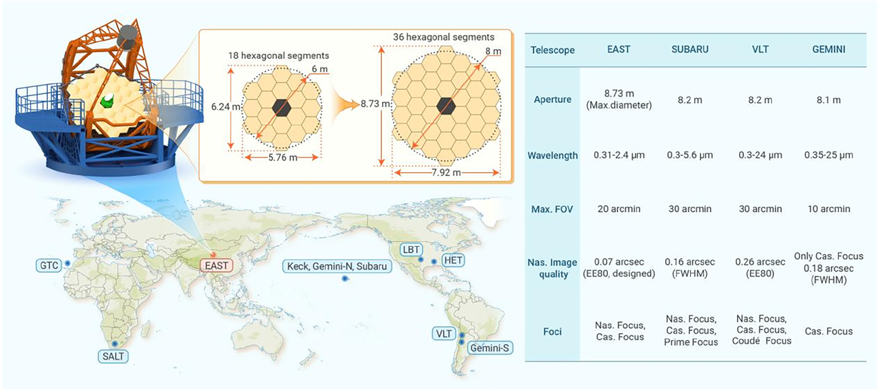 天文学在我国战略、科技和社会发展中有着不可替代的作用。它以最先进的探测技术获取来自宇宙的信息,使人类可以探究宇宙世界一些最基本的科学问题。大型天文望远镜是体现一个国家科技发展水平的重要标志。目前,国外6米以上口径光学天文望远镜主要为美国、欧洲、日本所有,安装于亚洲以外的美洲、欧洲和非洲。最大口径为10米,包括美国的两台Keck望远镜和HET望远镜、欧洲的GTC望远镜、南非的SALT望远镜。这些望远镜大部分为通用型望远镜,是目前取得主要天文发现的主力军。如2020年诺贝尔物理学奖就颁发给了利用美国Keck(两台10米)和欧洲VLT(4台8米)望远镜发现银河系中心黑洞的科学家。
