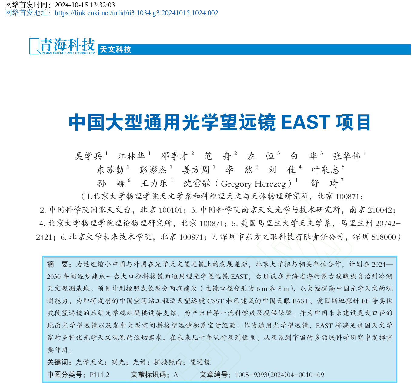 10月15日:由EAST筹备委员会部分成员与北京大学、国家天文台、南京天光所等单位人员合作撰写的《中国大型通用光学望远镜EAST项目》一文在《青海科技》刊物2024年第4期正式发表。