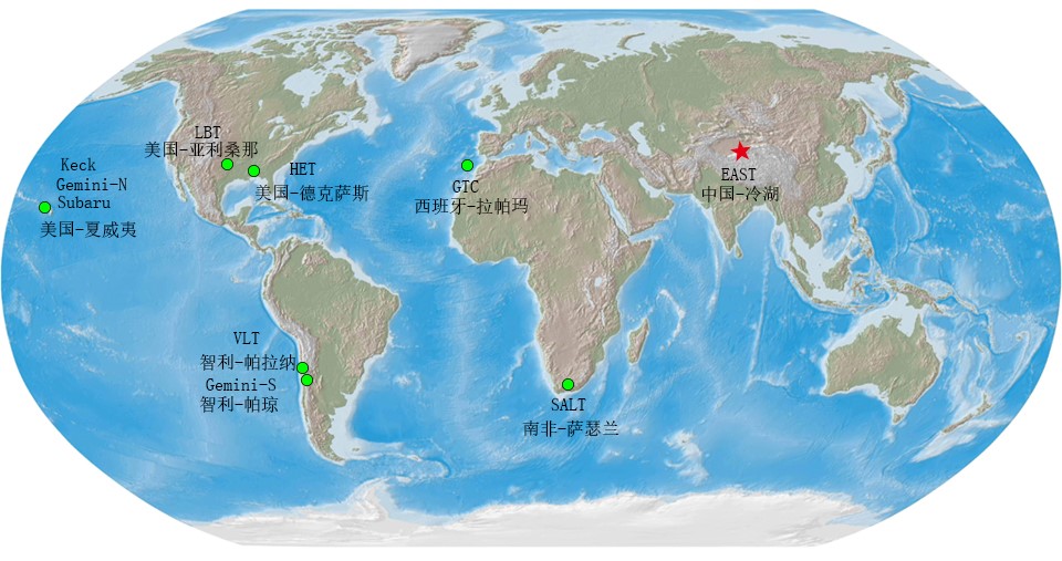 全球8-10米口径光学望远镜分布图。EAST望远镜将填补东半球空白(南京天光所提供)