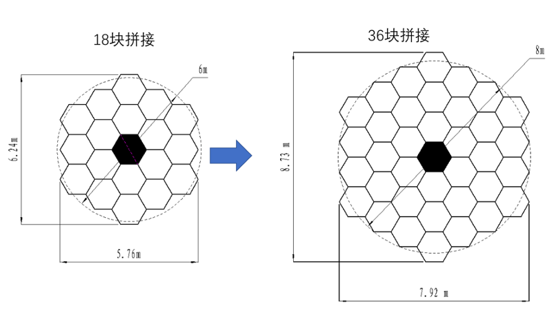 The 6-8 meter general-purpose optical telescope adopts the segmented mirror technology, which can be constructed in two phases for a total of 7 years. In the first phase (the first five years, 2024-2028), the supporting frame and dome will be built, and the main mirror will be segmented by 18 hexagonal mirrors (the sub-mirror size is 1.44 meters), with a diameter of about 6 meters (5.76 * 6.24 meters) and the effective aperture of 5.5 meters. In the second phase (the next two years, 2029-2030), 18 more hexagonal segments will be added in the outer part, expanding it to a diameter of about 8 meters (7.92 * 8.73 meters) and the effective aperture of 7.8 meters. The first phase of focal plane instruments includes imaging cameras and low-medium resolution imaging spectrometers, and the second phase includes high-resolution spectrometers, multi-object spectrometers, polarimeter, and adaptive optical systems. The total cost of the project is estimated to be 500 to 600 million Chinese yuan.